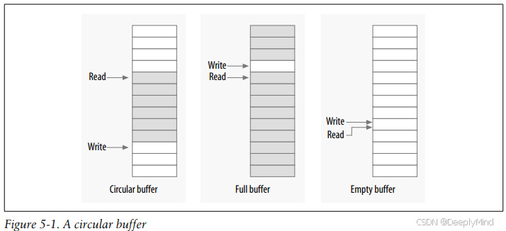 Figure 5-1 shows circular buffer in several states of fill. This buffer has been defined such that an empty condition is indicated by the read and write pointers being equal, while a full condition happens whenever the write pointer is immediately behind the read pointer (being careful to account for a wrap!). When carefully programmed, this buffer can be used without locks.