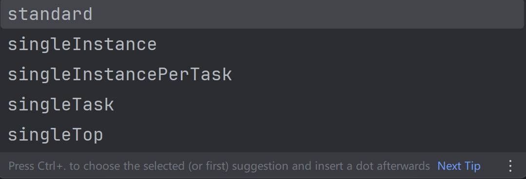 | standard | 标准模式,无论何时启动哪个活动,都是重新创建该页面的实例并放入栈顶。如果不指定 launchMode 属性,则默认为标准模式 |