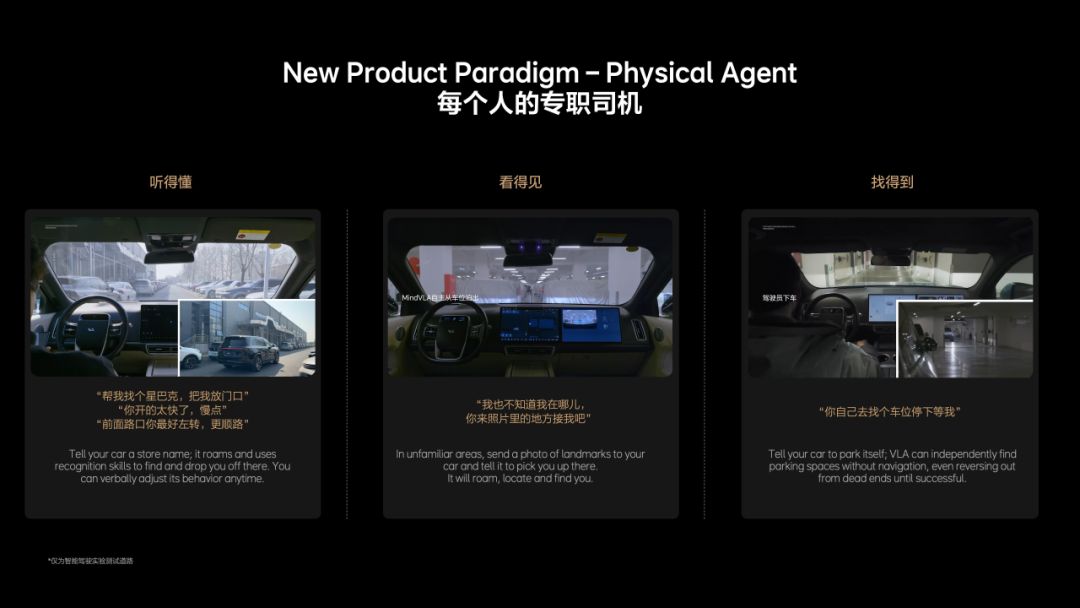 - 语音控车,通过VLA模型,系统可以根据语音指令做出对应的驾驶决策,并且当用户意愿与导航信息相冲突时,VLA模型会优先采纳用户意愿。