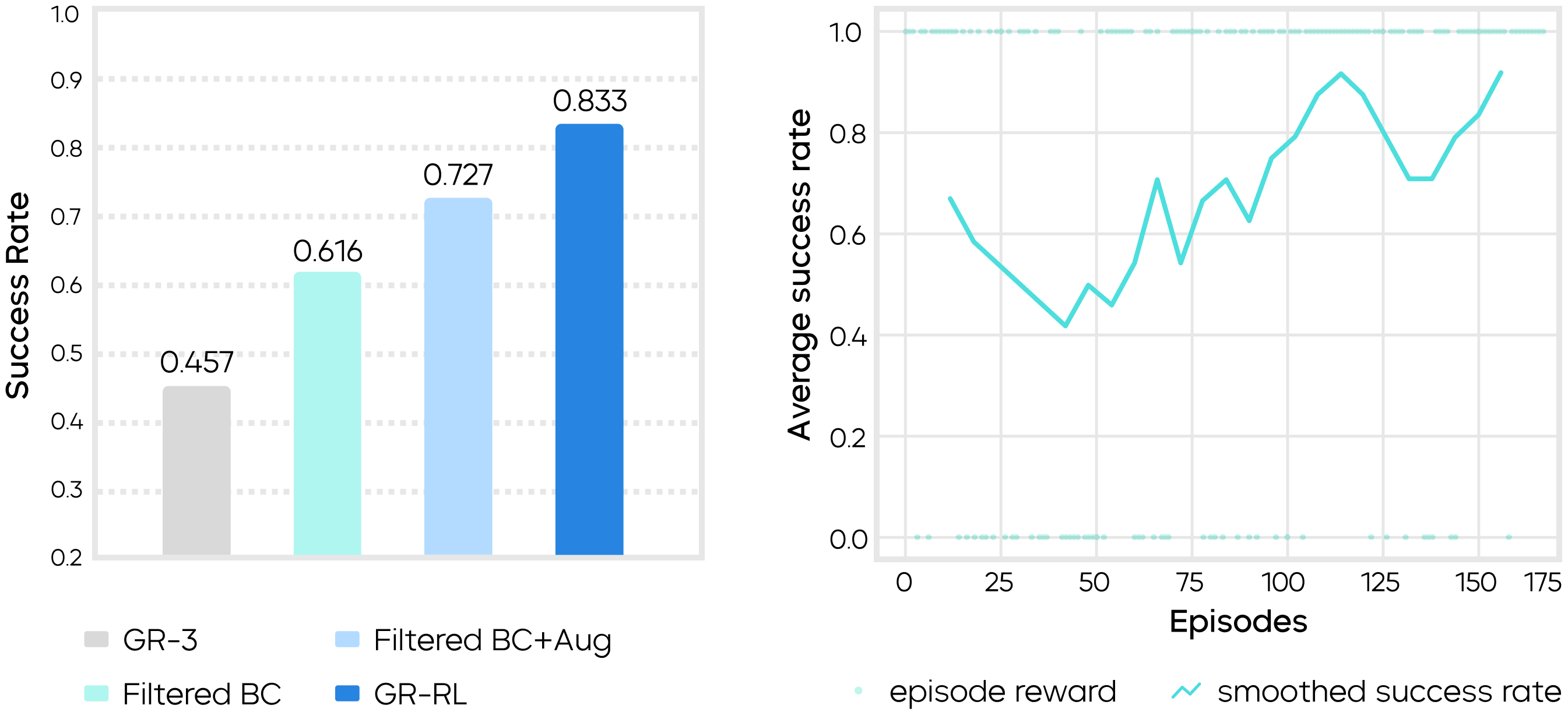 效果:实现部署对齐,突破成功率瓶颈 在线引导阶段通过“适配部署优化”,让GR-RL的性能实现最终突破: 整体成功率提升:前两阶段的基础政策(Filtered BC+Aug.)成功率为72.7%;经过500步在线RL优化后,最终成功率稳定在83.3%。