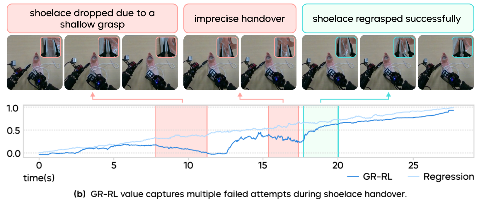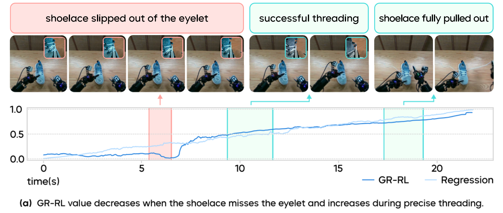 是否成功的逻辑条件,在GR-RL的系鞋带任务中,具体指“鞋带被精准穿入正确鞋眼,并完全放置在桌面上”,只有满足这一条件的轨迹才被视为成功;