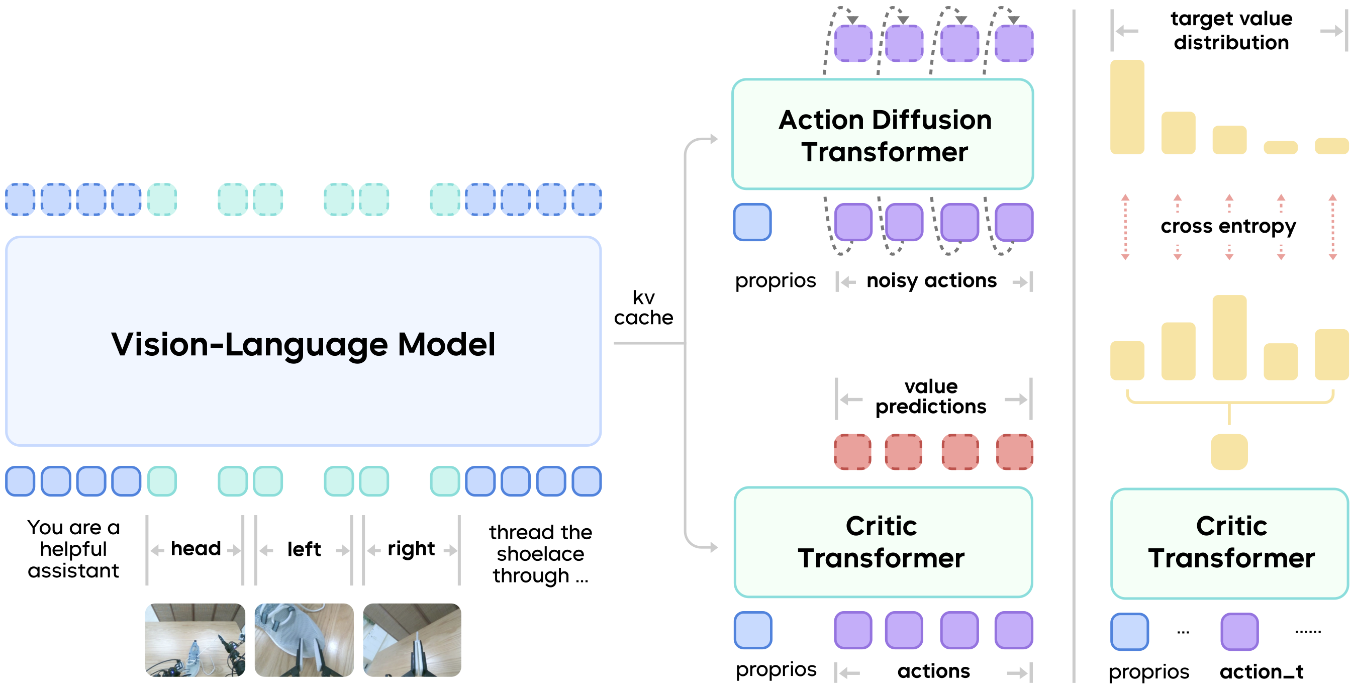 - 该网络采用因果Transformer结构,遵循“Q-chunking”策略,为每个动作块预测一整段Q值,而非单一时间步的价值,这种设计更适配政策网络生成的“动作块”模式,确保价值评估与动作生成的粒度一致。