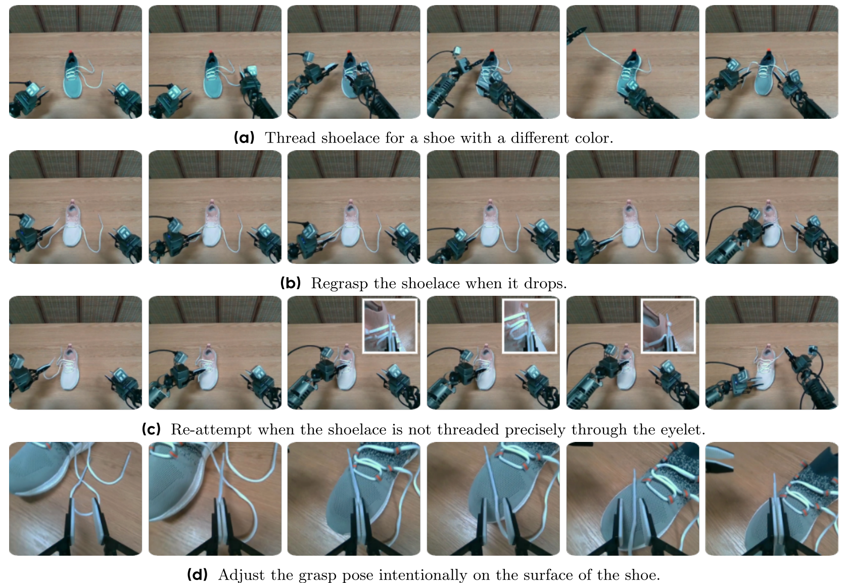 当AI在图像生成、语言理解领域不断刷新我们的认知时,机器人操作领域却始终面临一个棘手的挑战:如何让机器人像人类一样,从容应对那些需要“长程规划+毫米级精度+柔性交互”的复杂任务?比如系鞋带这个看似简单的动作,要拿起柔软易变形的鞋带、精准对准细小的鞋眼、连贯完成多步穿拉流程,每一个环节都在考验机器人的“灵巧度”与“稳健性”,而这正是长期以来机器人落地真实场景的难点所在。