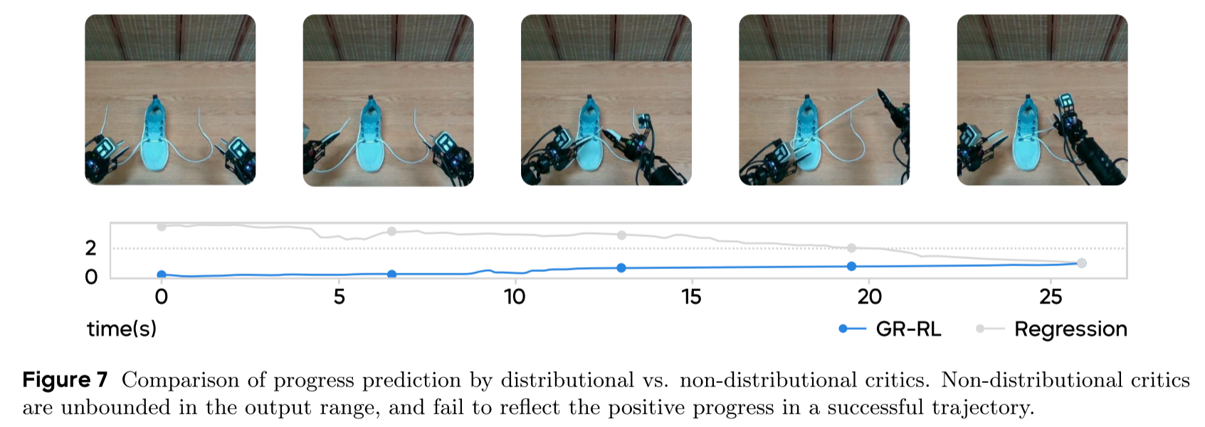 - 一方面,长程任务(如系鞋带需完成“拾鞋带→穿多鞋眼→交接→拉拽”多步骤)中,中间步骤的“部分成功”难以定义——例如“对准鞋眼但未穿入”虽比“未对准”更接近目标,却未真正推进任务,若给予“部分奖励”(如0.5),会导致评论家误判“无效动作的价值”。而公式1仅以“最终是否成功”为奖励标准,彻底规避了“主观定义中间奖励”的难题,让评论家只能通过对比“成功轨迹与失败轨迹的动作差异”,自主学习到“哪些动作能导向任务成功”。