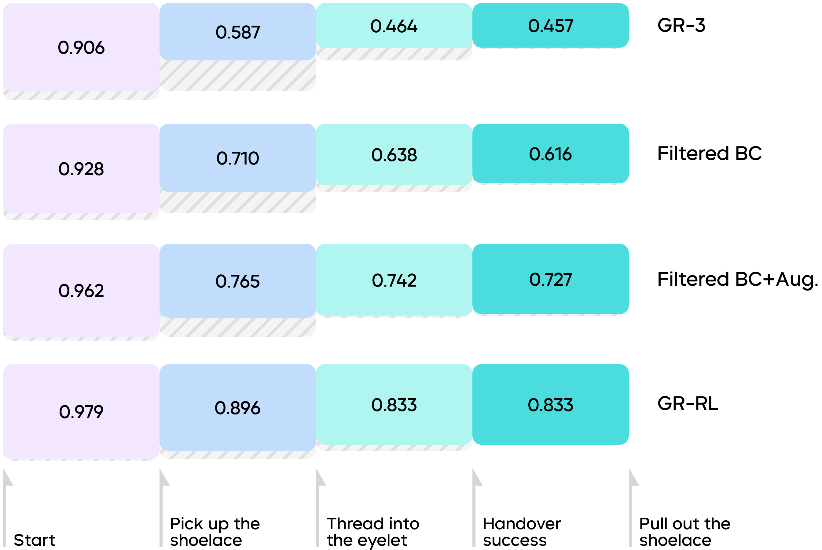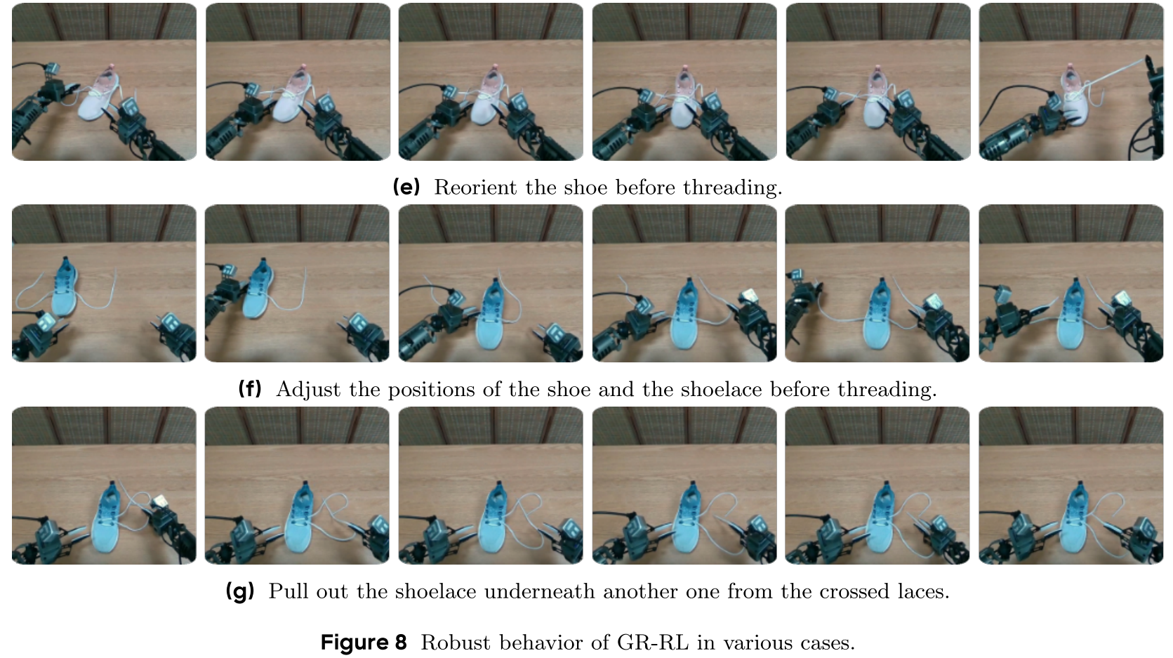 关键操作帧对比则选取“拾鞋带”“穿眼”“交接鞋带”三个核心环节的典型帧,展示GR-RL政策的行为细节:拾鞋带时,机械臂能精准定位鞋带中端,夹爪轻缓闭合避免鞋带滑动;穿眼时,腕部微调角度确保鞋带尖端与鞋眼精准对齐,动作幅度控制在毫米级,无偏移;交接鞋带时,双臂协同调整姿态,传递过程中无鞋带脱落,且移动基座配合微调位置以减少臂部操作负担,对比原始政策“拾鞋带偏移”“穿眼偏差”“交接脱落”的问题,GR-RL学习到的行为更贴合任务需求,精密性与协调性显著提升。