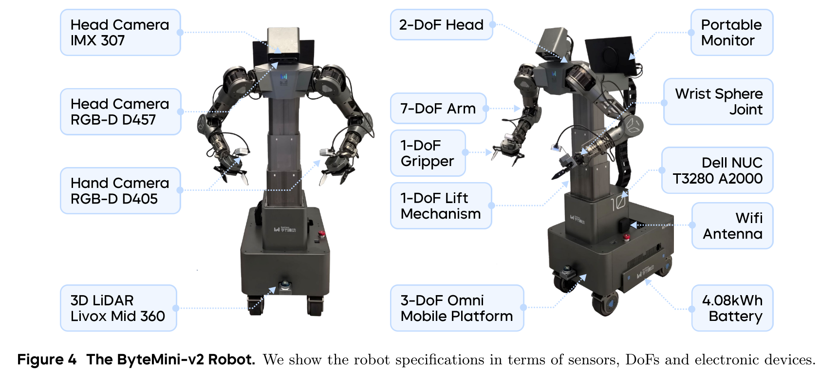 实验选用的机器人平台以“移动基座+双臂协作”为核心架构,专为长程灵巧精密操作(如系鞋带)设计,关键硬件参数与功能如下:
