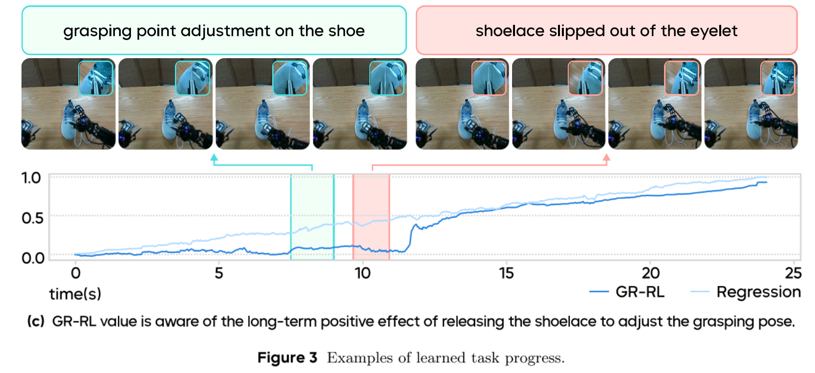 不仅能识别“推动任务的有效动作”(如精准对准鞋眼),还能捕捉“导致失败的无效动作”(如犹豫微调、鞋带滑落),最终具备“稳健评估任务进度”的能力,而非仅能判断“步骤完成度”的简单模型。