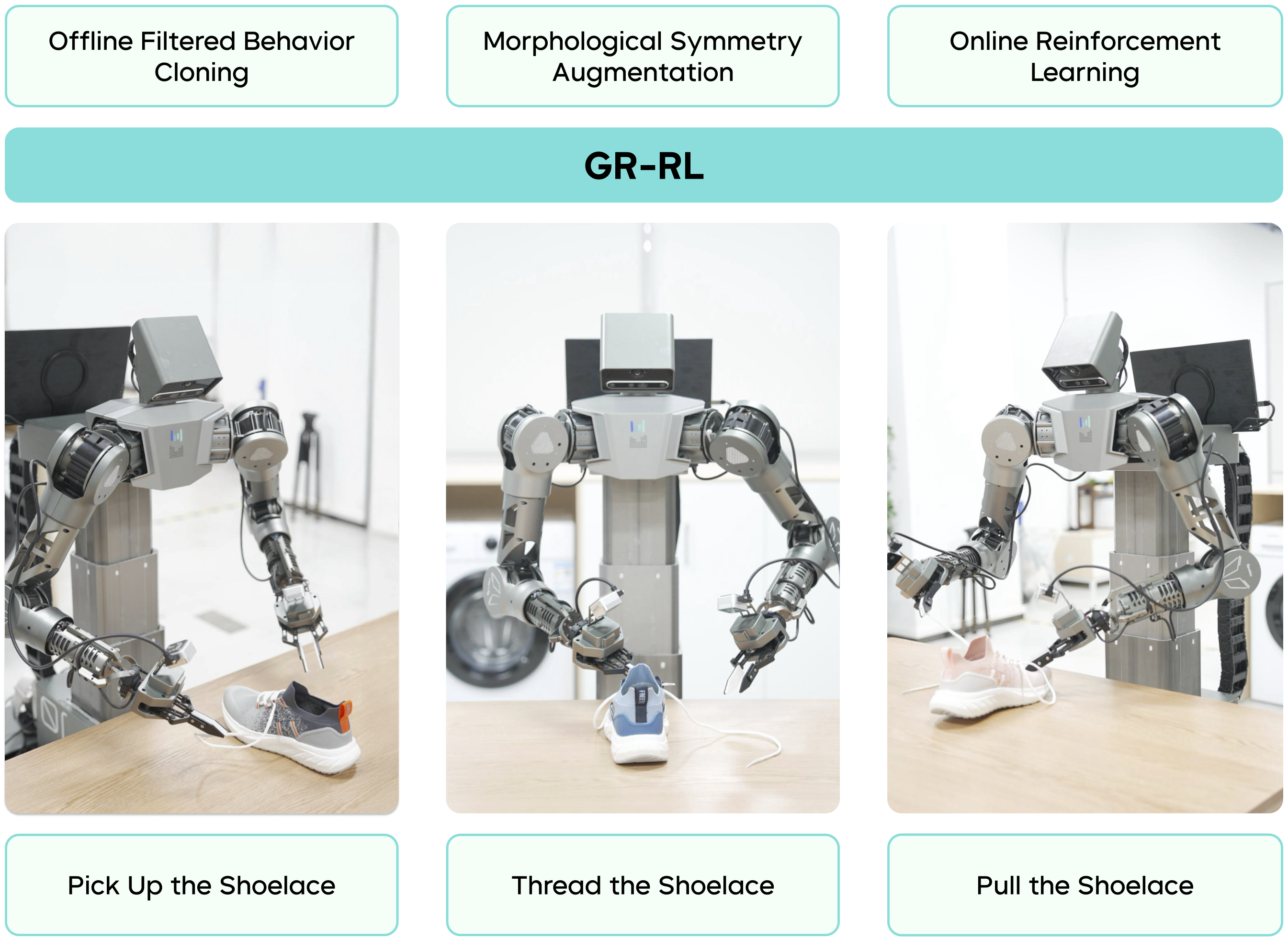 近日,字节跳动(ByteDance Seed)团队提出的GR-RL框架,为这一难题交出了亮眼的答卷。这项研究不仅让机器人首次实现了“自主系鞋带”,且成功率达到83.3%,更重要的是,它构建了一套完整的解决方案,能将通用的视觉-语言-动作(VLA)模型(如字节此前的GR-3)转化为专注长程精密操作的“专家型政策”,为机器人在真实世界中可靠工作提供了关键思路。