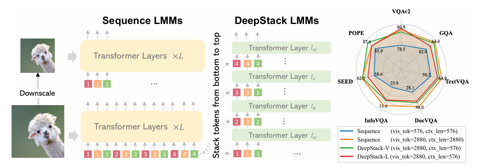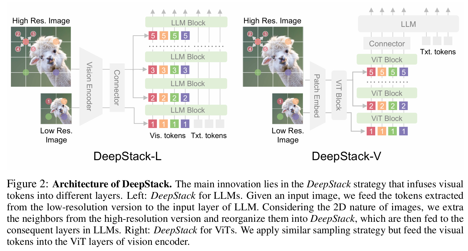 - 浅层融合导致信息丢失:传统模型仅将视觉编码器(如 ViT)最后一层的特征转化为视觉 token,与文本 token 在 LLM 的输入层一次性拼接。这种 “单层级输入、单阶段融合” 的模式,会导致视觉信息在 LLM 的深层解码过程中逐步稀释 —— 例如,图像中的小物体细节、复杂图表的结构信息,可能在经过多层 Transformer 计算后被 “覆盖”,无法参与后续语义推理。