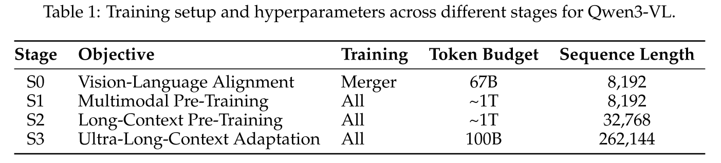 Qwen3-VL 的训练方案围绕 “渐进式能力构建” 核心逻辑设计,基于 “视觉编码器优化→三模块架构协同训练” 的基础,将预训练划分为四个递进阶段,从基础的视觉 - 语言对齐逐步扩展至 256K tokens 的超长上下文处理能力。