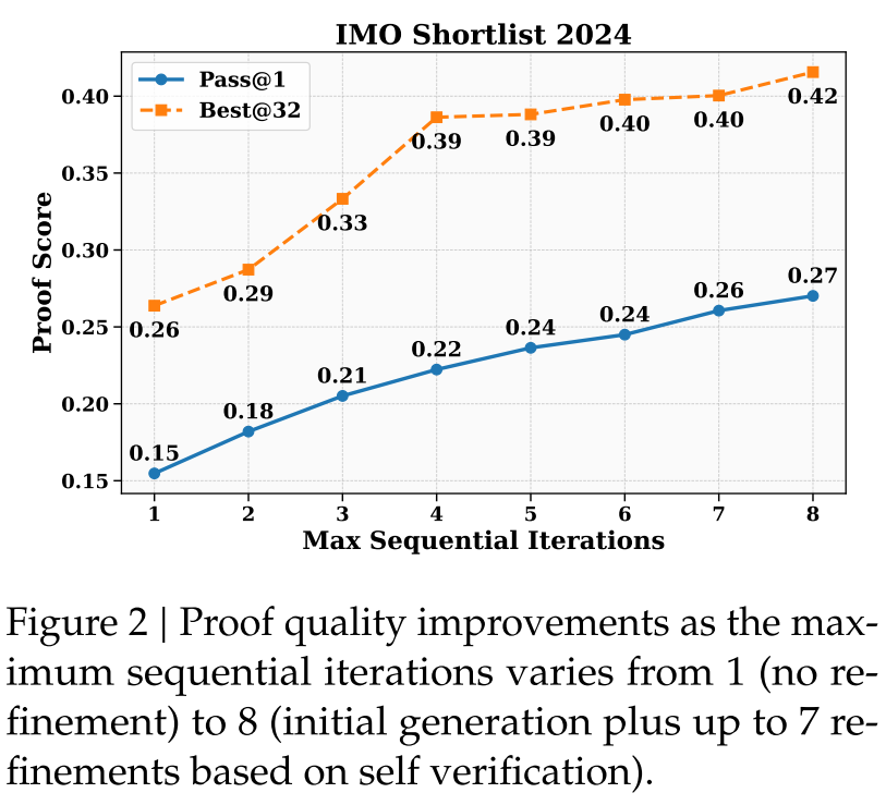该评估以IMO Shortlist 2024(31题,IMO备选难题)为基准,启动32个独立的迭代线程,采用“Pass@1”与“Best@32”两个核心指标:Pass@1指每个线程最终输出证明的平均分数,反映模型迭代优化的整体稳定性;Best@32指每个问题在32个线程中,由模型自评分最高的证明分数,反映模型识别高质量证明的能力。结果如图2所示:一方面,Pass@1随最大迭代次数从1增加到8而显著提升,说明自验证能有效引导模型定位推理缺陷并逐步修正,迭代机制对复杂问题的证明质量提升至关重要;另一方面,Best@32的分数远高于Pass@1,且随着迭代次数增加差距进一步扩大,这证明模型能准确判断自身证明的质量——即能可靠区分“高质量证明”与“有缺陷证明”,其自评估能力可有效支撑迭代优化,避免陷入“盲目修正”的误区。