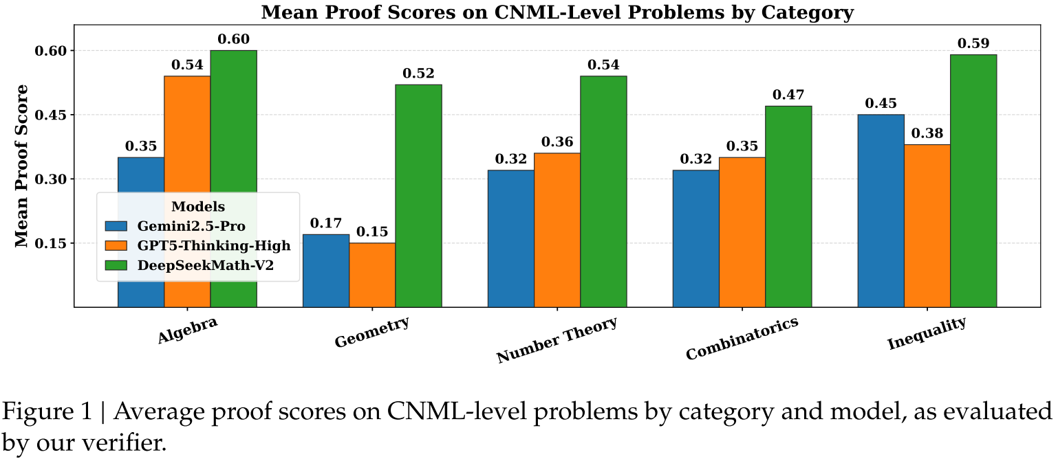 单轮生成评估聚焦模型“无迭代优化时的一次性证明能力”,核心检验其基础推理的准确性与通用性。实验中,针对内部构建的CNML级问题集(91题,覆盖代数、几何、数论、组合、不等式五大领域),为每个问题生成8份证明样本,再通过8份由最终验证器输出的分析报告进行“多数投票”,判断证明正确性(即多数分析认为正确则判定为有效)。结果显示,在所有类别的CNML级问题中,DeepSeekMath-V2的平均证明分数均持续高于GPT-5-Thinking-High(OpenAI, 2025)与Gemini 2.5-Pro(DeepMind, 2025)——例如在几何与组合数学这类对逻辑步骤严谨性要求极高的领域,模型优势尤为明显,这表明DeepSeekMath-V2在无需后续优化的情况下,已具备跨数学领域的 superior 定理证明能力,其基础推理逻辑的完整性与准确性超过当前主流大语言模型。
