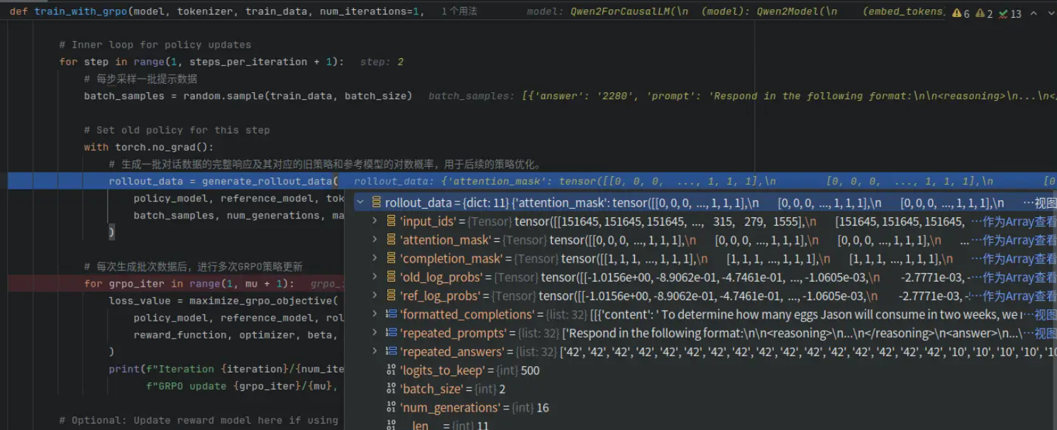 此函数是您的原始工作代码(train_with_grpo_static),增加了一个外层循环,用于根据伪代码进行迭代 GRPO 更新。参数: