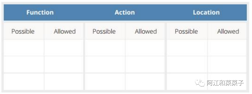 - 限制将一系列可能的行为降级为允许的行为。下表展示了一种用户罗列控制矩阵的可行 的方法。