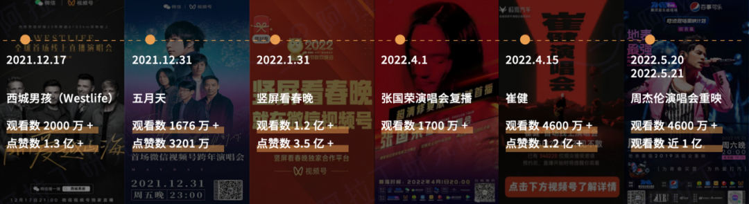 据《2022 年 H1 视频号发展白皮书》统计,2021 年 12 月 17 日,西城男孩视频号演唱会观看数突破 2000 万,点赞数超过 1.3 亿。短视频演唱会的风潮由此开启。