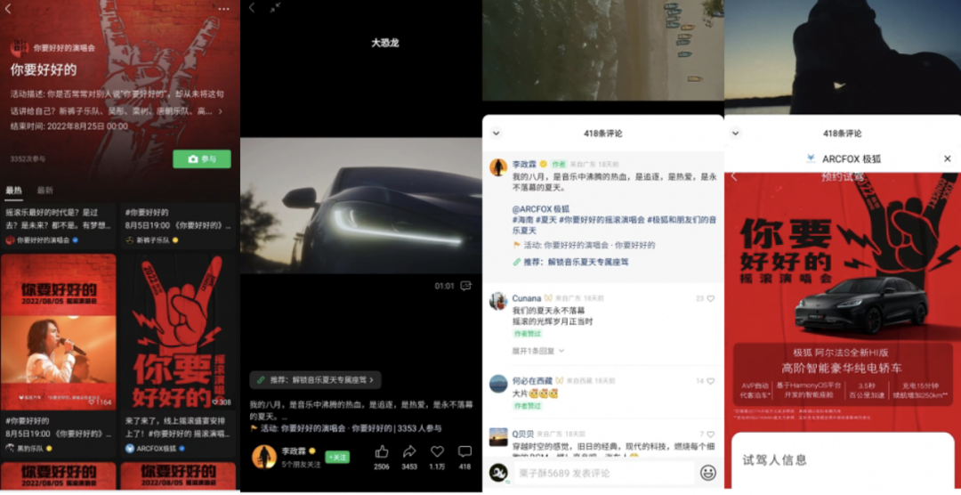 最后也是最关键的,所有的铺垫和服务都是为了终极目标——销售。极狐汽车的小程序是试驾体验的主要入口,日常依靠品牌页广告和公众号跳转获得线索。内容营销一侧更是花样百出:崔健演唱会期间推出的活动页面显示,5 月 20 日前有效留资者均可享受演唱会现场四重专属福利;“你要好好的”演唱会同样设置了活动,参与活动的视频号主发布视频时可挂载页面链接,用户填写资料即可预约试驾,定车还有机会享受亲临现场的福利,如果是朋友推荐,推荐者还可获得相应积分。整套活动中留资、试驾、预定都轻松囊括其中且毫无违和。