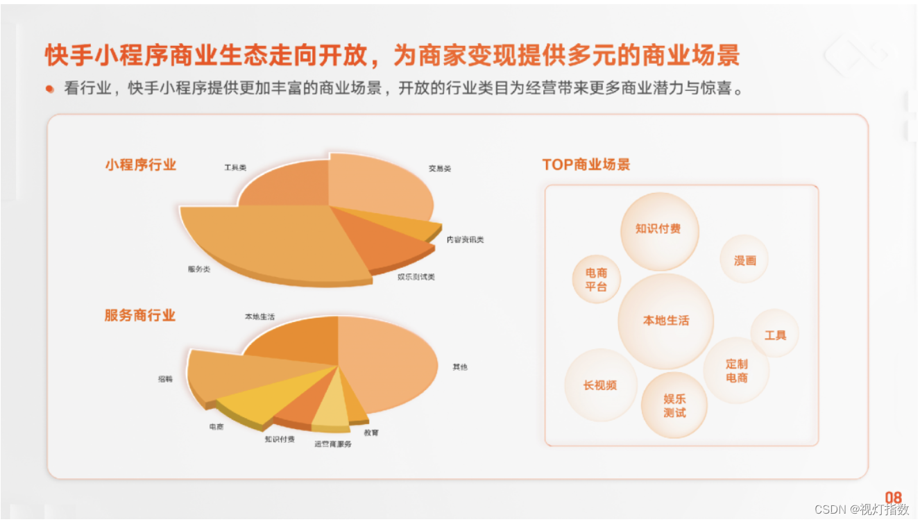 快手作为头部短视频+直播内容平台之一,围绕平台流量优势构建丰富的内容连接场景,探索多元商业能力,打造了低开发接入成本、多场景营销链路、持续开放探索的小程序商业生态,全面拥抱开发者和经营者共创美好未来。在平台业务布局整合、技术能力积累、激励政策扶持的共同作用下,快手小程序DAU近 2000 万,GMV 较去年增长 73 倍,越来越多的开发者和经营者从中受益,充分展示了快手的生态价值与潜力。