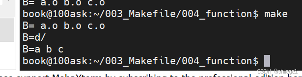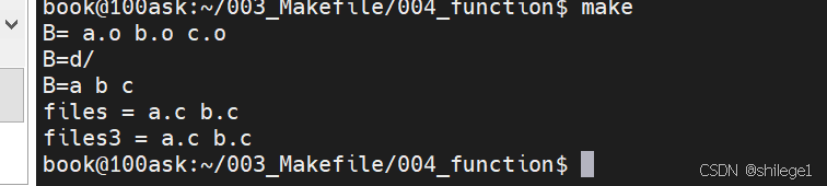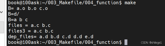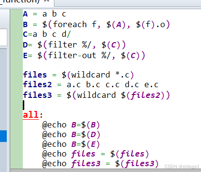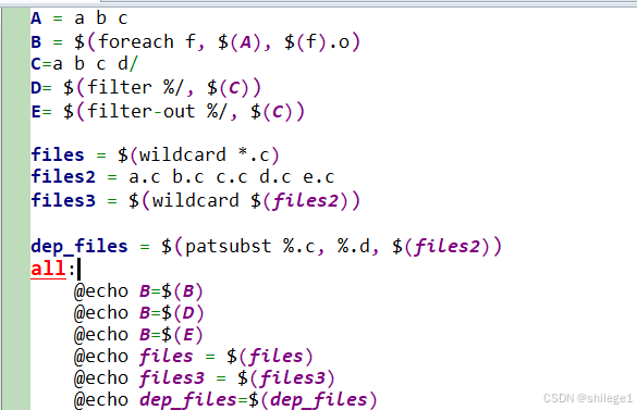 d. $(patsubst pattern,replacement,test) #把列表中符合pattern的值替换成replacement