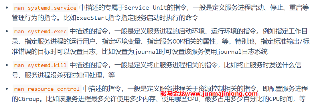 [Unit] 和 [Install] 段的配置指令都来自于 man systemd.unit,这些指令都用于描述作为 Unit 时的属性,[Service] 段则专属于.Service 服务配置文件。