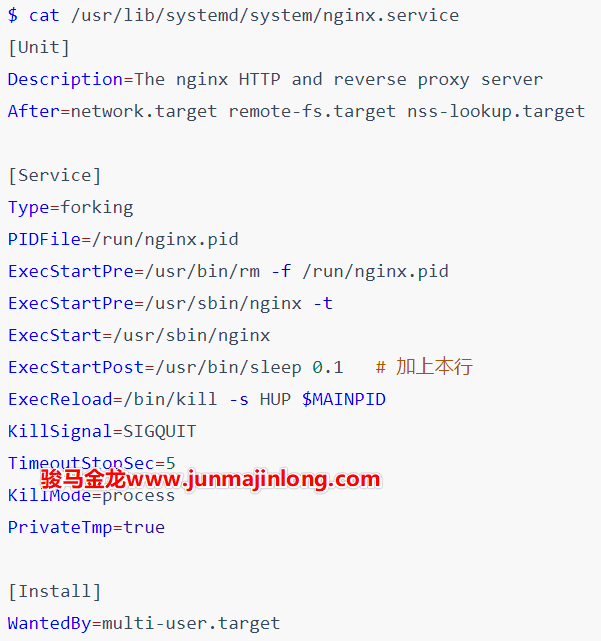 再例如,nginx 命令默认是以 daemon 模式运行的,simple 类型下直接使用 nginx 命令启动服务,systemd 会立刻杀掉所有 nginx,即 nginx 无法启动成功。