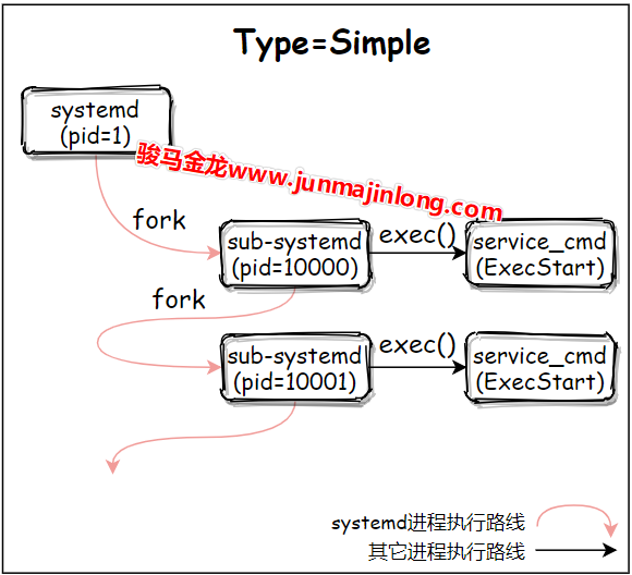 例如,先后连续启动两个 Type=simple 的服务,进程流程图大概如下: