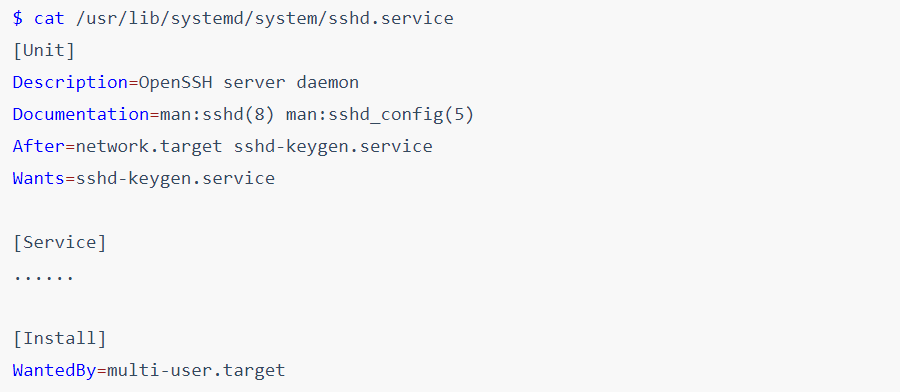 - Install:定义本服务在设置服务开机自启动时相关的属性。换句话说,只有在创建 / 移除服务配置文件的软链接时,Install 段才会派上用场。这一配置段不是必须的,当未配置