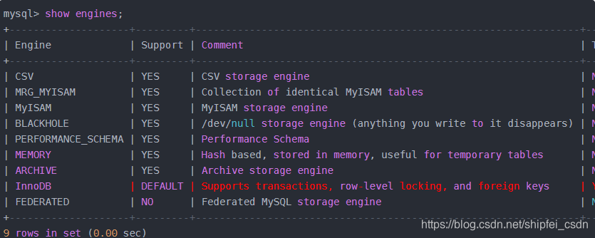 MyISAM的特点是查询速度快、存储空间小,原因是在磁盘上分成三个文件存储:.frm(存储表定义),.MYD(MYData,存储数据),.MYI(MYIndex,存储索引),SELECT COUNT(*) FROM TABLE时,避免了全表扫描。