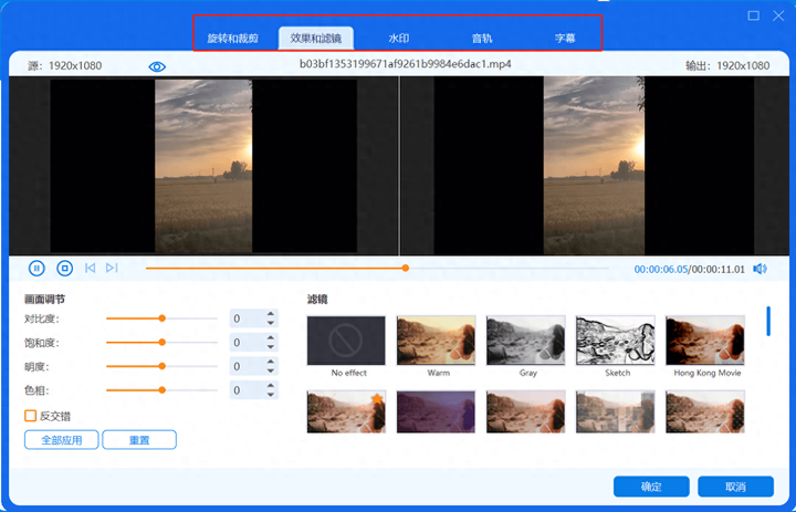 第六步:在编辑界面中,我们可对视频进行旋转、裁剪、添加滤镜和颜色、以及添加水印、音轨和字幕,您可以根据自己需要进行设置。设置好后点击“确定”按钮,即可回到主界面。