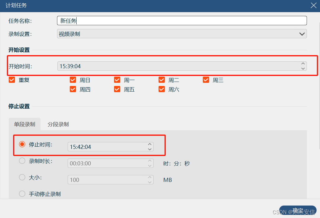 第四步:创建新任务后,我们可以选择录制的开始时间和停止时间,以及录制完成后电脑的动作,我们可设置睡眠、关机以及退出程序。