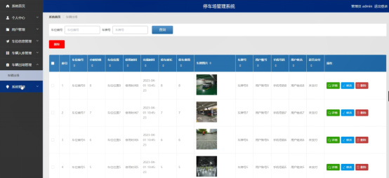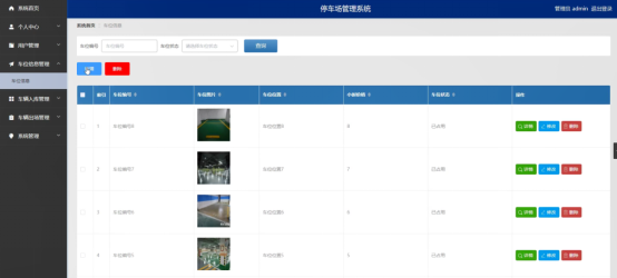 管理员点击车位信息管理。进入车位信息页面输入车位编号和选择车位状态进行查询、新增和删除车位信息列表,并根据需要对车位详细信息进行详情,修改和删除操作;如图5-8所示:
