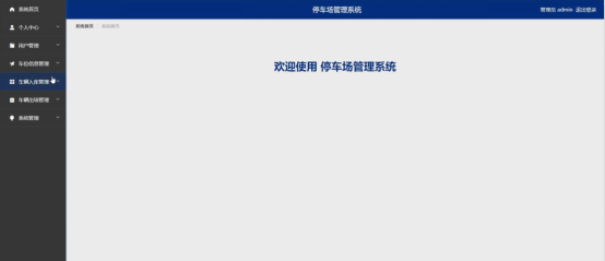 管理员进入主页面,主要功能包括对个人中心、用户管理、车位信息管理、车辆入库管理、车辆出场管理、系统管理等进行操作。管理员主页面如图5-6所示: