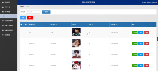 管理员点击用户管理。进入用户页面输入用户账号进行查询、新增和删除用户列表,并根据需要对用户详细信息进行详情,修改和删除操作;如图5-7所示: