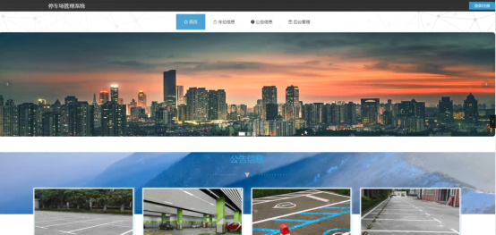 当人们打开系统的网址后,首先看到的就是首页界面。在这里,人们能够看到停车场管理系统的导航条,通过导航条导航进入各功能展示页面进行操作。系统首页界面如图5-1所示: