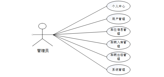 (1)、管理员关键功能包含个人中心、用户管理、车位信息管理、车辆入库管理、车辆出场管理、系统管理等进行管理。管理员用例如下:
