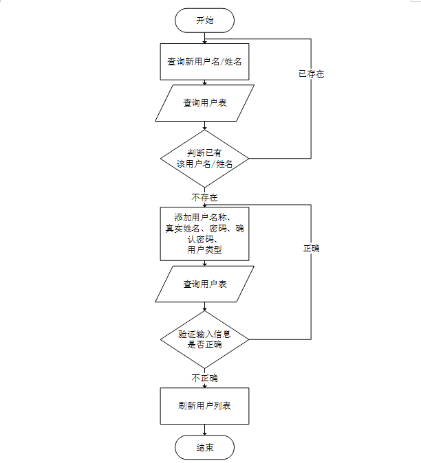 添加新用户的流程是先查询新用户名是否已存在,如已有该用户名,需重拟用户名并同时输入新用户的其它信息,添加新用户到数据库时会先验证数据是否完整,信息都正确且完整时,返回并刷新用户列表;信息不正确时,会返回输入信息的那一步。该流程如图3-4所示。