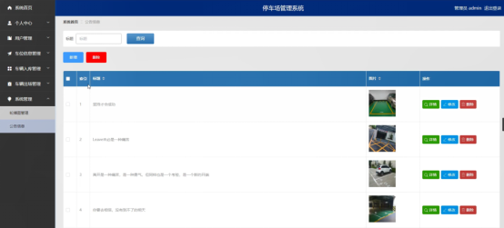 管理员点击系统管理可以对轮播图管理进行详情或修改操作,在公告信息页面输入标题进行查询,新增或删除公告列表,并对公告详细信息进行详情,修改和删除操作;如图5-11所示: