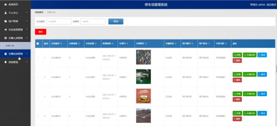 管理员点击车辆入库管理。进入车辆入库页面输入车位编号和车牌号进行查询或删除车辆入库列表,并根据需要对车辆入库详细信息进行详情、车辆出场、修改或删除操作;如图5-9所示: