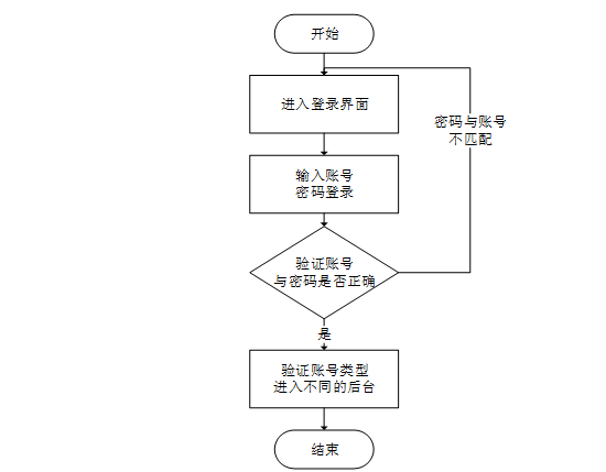 登录流程是该系统的第一个流程,登录的第一步是输入账号、密码登录,系统会验证账号与密码是否正确,正确时系统会判断账号类型再进入不同的后台;不正确时,会返回到登录的第一步,输入用户重新执行登录流程。该流程如图3-3所示。
