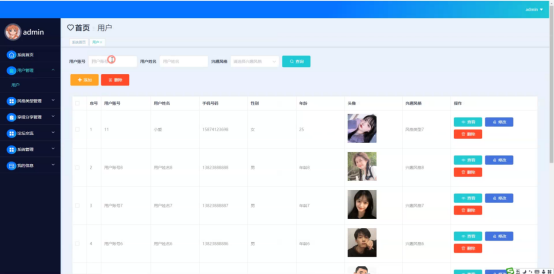 用户管理;在用户管理页面输入用户账号、用户姓名、兴趣风格进行查询、添加或删除用户管理列表,并对用户管理详细信息进行查看、修改或删除操作;如图5-8所示: