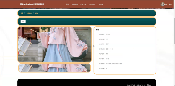 穿搭分享:在穿搭分享页面的输入栏中输入穿搭名称、风格类型、穿搭季节进行查询,可以查看到穿搭分享详细信息,并根据需要进行评论操作;穿搭分享页面如图5-3所示: