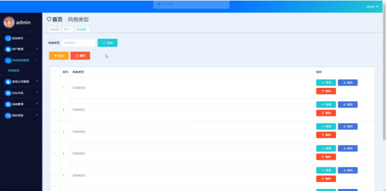 风格类型管理;在风格类型管理页面输入风格类型进行查询、添加或删除风格类型管理列表,并对风格类型管理详细信息进行查看、修改或删除操作;如图5-9所示: