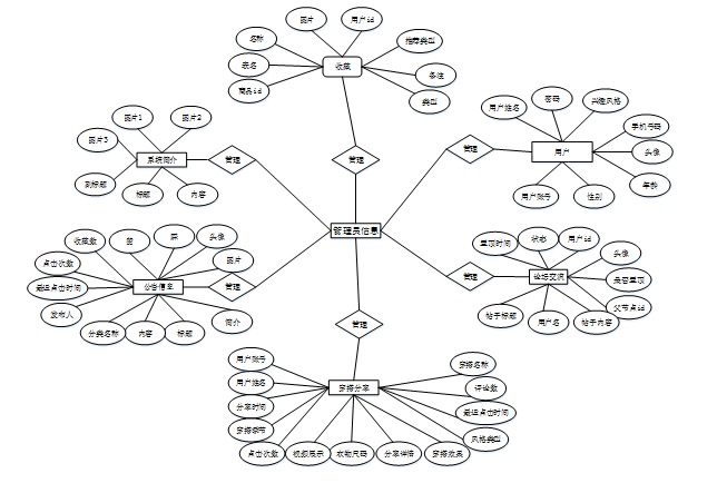 在一个资料模式中,一个被称作“实例”的实体,与真实的“事件”或者“物体”相匹配,可以与其它物体区分开来。例如,公司中的每个员工,家里中的每个家具。ER图是由实体及其关系构成的图,通过E/R图可以清楚地描述系统涉及到的实体之间的相互关系。在系统中对一些主要的几个关键实体如图:以下将“用户、穿搭分享、论坛交流、公告信息、系统简介、收藏”等作为实体,它们的局部E-R图,如图4-2所示:
