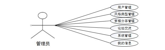 (1)管理员主要功能包括用户管理、风格类型管理、穿搭分享管理、论坛交流、系统管理、我的信息等,管理员用例图如下所示: