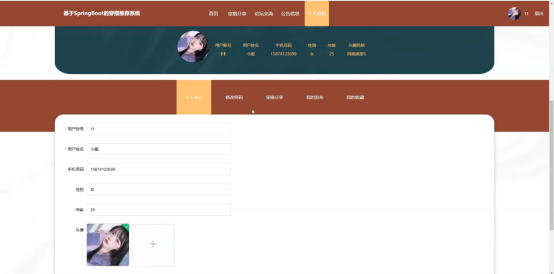 个人中心:在个人中心页面输入个人信息可以进行更新操作,并根据需要对个人中心、修改密码、穿搭分享、我的发布、我的收藏进行详细操作;如图5-5所示: