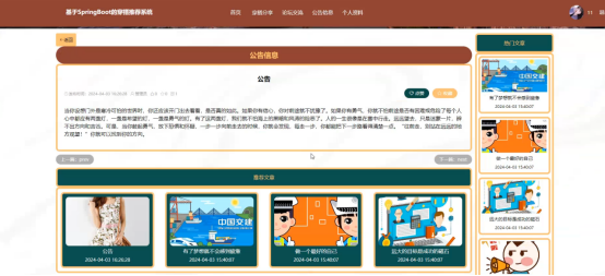 公告信息:在公告信息页面的输入栏中输入标题进行查询,可以查看到公告信息详细信息,并根据需要进行点赞或收藏操作;公告信息页面如图5-4所示: