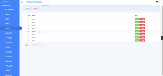 科室功能在视图层(view层)进行交互,比如点击“搜索、添加信息或批量删除”按钮或填写科室信息表单。这些科室表单动作被视图层捕获并作为请求发送给相应的控制器层(controller层)。控制器接收到这些请求后,调用服务层(service层)以执行相关的业务逻辑,例如验证输入数据的有效性和与数据库的交互。服务层处理完这些逻辑后,进一步与数据访问对象层(DAO层)交互,后者负责具体的数据操作如修改或删除科室信息,并将操作结果返回给控制器。最终,控制器根据这些结果更新视图层,以便科室功能可以看到最新的信息或相应的操作反馈。科室界面如图5-9所示: