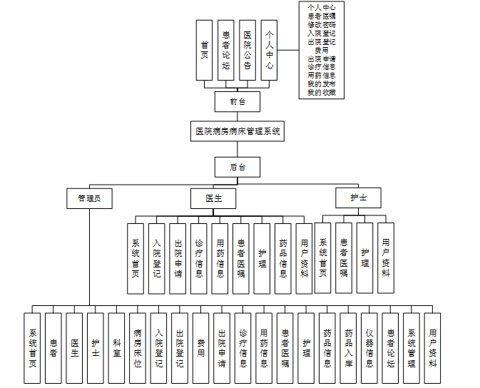 本论文中实现的医院病房病床管理系统将以患者、医生和护士核心的日常信息维护工作为主,主要涵盖了患者、医生、护士、科室、病房床位、入院登记、出院登记、费用、出院申请、诊疗信息、用药信息、患者医嘱、护理、药品信息、药品入库、仪器信息、患者论坛、系统管理、用户资料等功能,采用该医院病房病床管理系统将满足管理员、患者、医生和护士日常管理工作的基本需求。本系统与患者、医生和护士操作的全过程相契合,从患者、医生和护士登录开始录入系统,然后记录医院病房病床信息,从而让患者、医生和护士对系统的管理都能够清晰规范,相应信息的检索和维护简单高效,进而提高患者、医生和护士整体工作的效率。