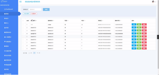 患者功能在视图层(view层)进行交互,比如点击“搜索、添加信息或批量删除”按钮或填写患者信息表单。这些患者表单动作被视图层捕获并作为请求发送给相应的控制器层(controller层)。控制器接收到这些请求后,调用服务层(service层)以执行相关的业务逻辑,例如验证输入数据的有效性和与数据库的交互。服务层处理完这些逻辑后,进一步与数据访问对象层(DAO层)交互,后者负责具体的数据操作如查看、修改或删除患者信息,并将操作结果返回给控制器。最终,控制器根据这些结果更新视图层,以便患者功能可以看到最新的信息或相应的操作反馈。患者界面如图5-6所示: