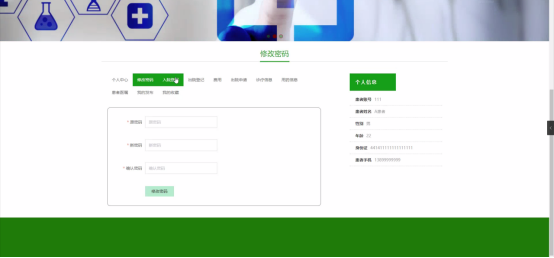 个人中心:我的入院、我的费用、我的诊疗、我的用药、我的收藏、密码修改。