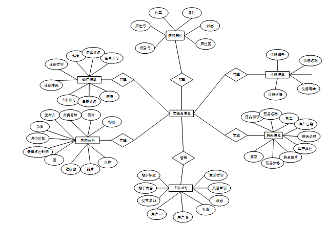 数据库在程序的设计中扮演了重要的角色,它将系统涉及的数据全部容纳其中,在数据库设计时,为了能够明确思路,清晰明了一般都是先构建E-R图,ER图是由实体及其关系构成的图,通过E/R图可以清楚地描述系统涉及到的实体之间的相互关系。在系统中将对 “患者论坛、药品信息、仪器信息、病房床位、诊疗信息、医院公告”等几个主要的实体属性进行布局,如图4-2所示: